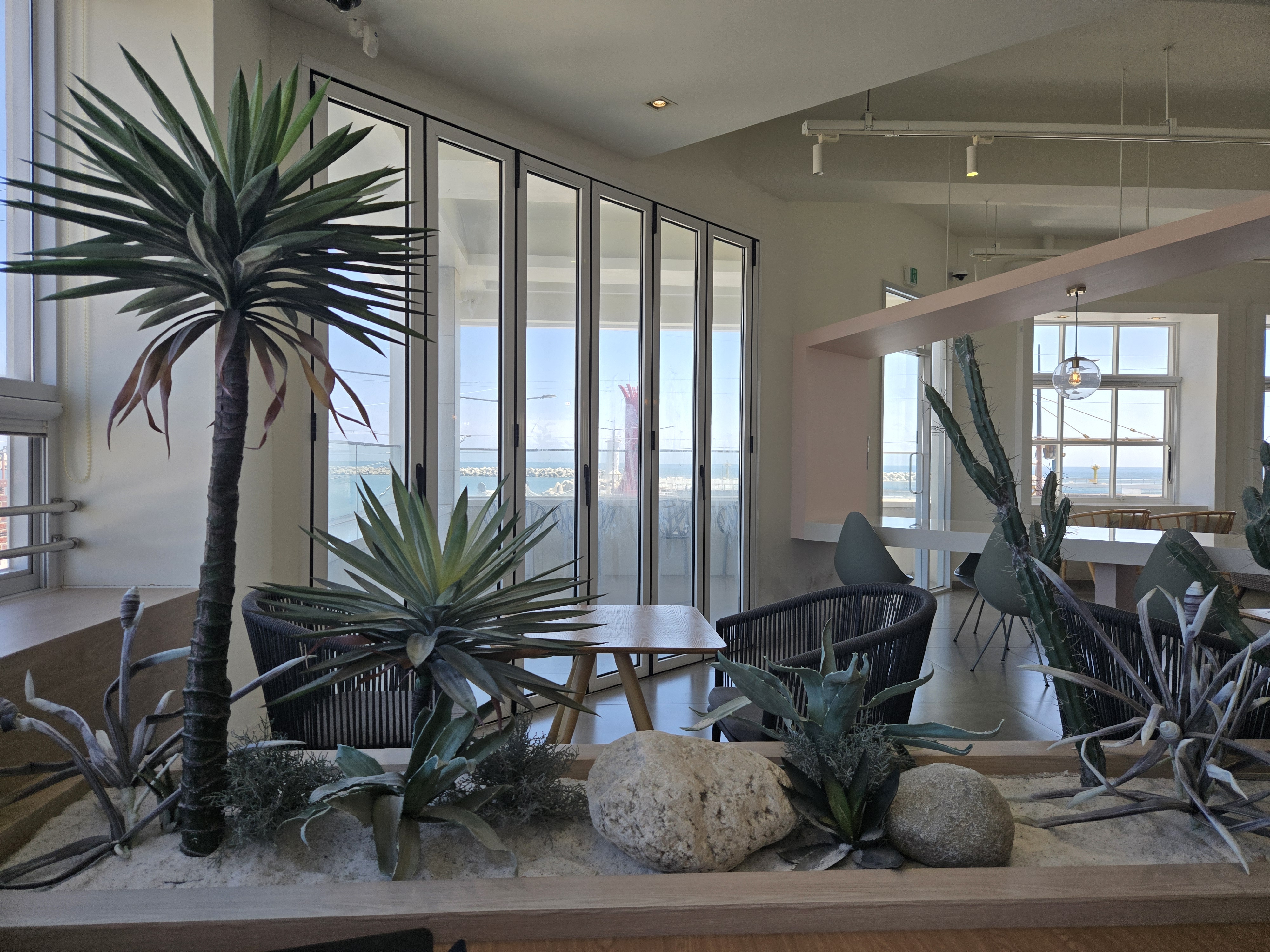 2층엔 다양한 좌석 구성이 있어서 혼자 조용히 책을 보거나 노트북 작업하기에도 좋고, 연인이나 가족 단위 손님들도 많았습니다. 날씨가 좋은 날에는 루프탑 좌석이 정말 인기 많아요. 바람을 맞으며 바다를 바라보며 마시는 커피는 말 그대로 힐링 그 자체였어요.
